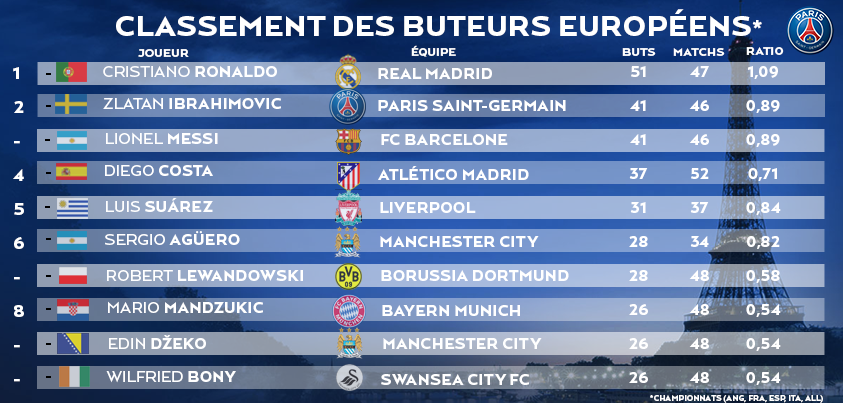 Nos últimos meses já se sabia que ia dominar a tabela de melhores marcadores da temporada, mas não deixa de ser impressionante o registo com que Cristiano Ronaldo terminou a época 2013/14. 51 golos em 47 jogos, não contando com os da Selecção, mais 10 golos que o 2.º posicionado Zlatan Ibrahimovic (41 golos em 46 jogos), sendo que o craque sueco estave empatado no topo com CR7 até ao final de Março (o português disparou a partir daí). Único jogador deste Top10 com mais de 1 golo/jogo, Cristiano Ronaldo também se sagrou Bota de Ouro da temporada juntamente com Luís Suárez (ambos marcaram 31 golos).